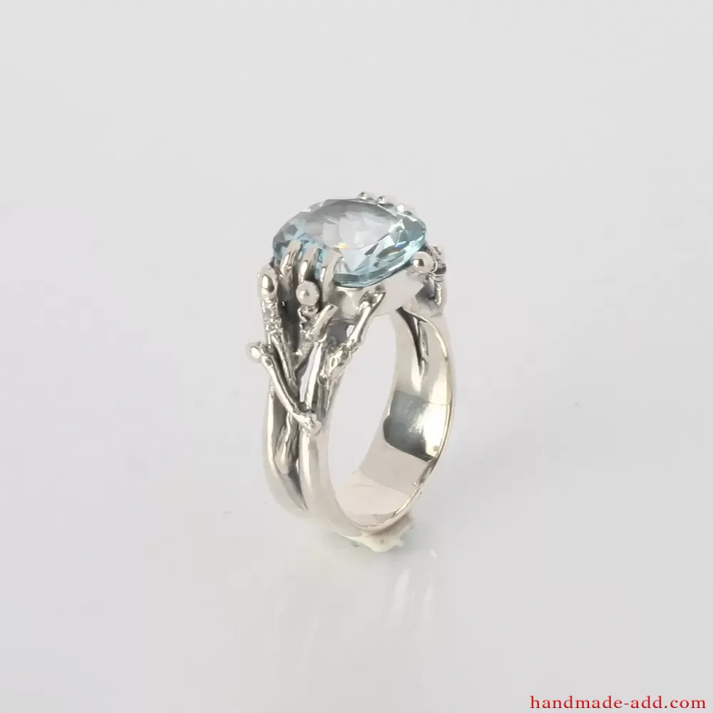 Handmade floral ring with natural sky blue topaz in sterling silver.